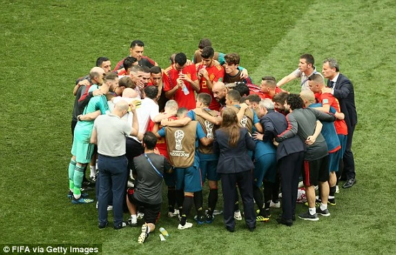 Các cầu thủ Tây Ban Nha hội ý trước khi bước vào hiệp phụ.