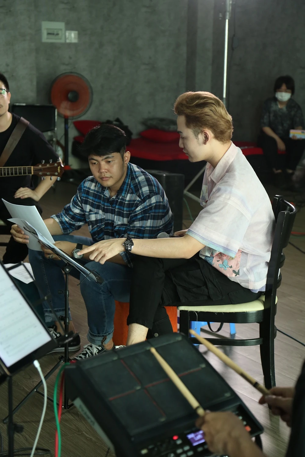 Andiez Nam Trương cùng Ali Hoàng Dương "cân đo" từng nốt nhạc trong buổi tập luyện đầu tiên. Ảnh: BEE