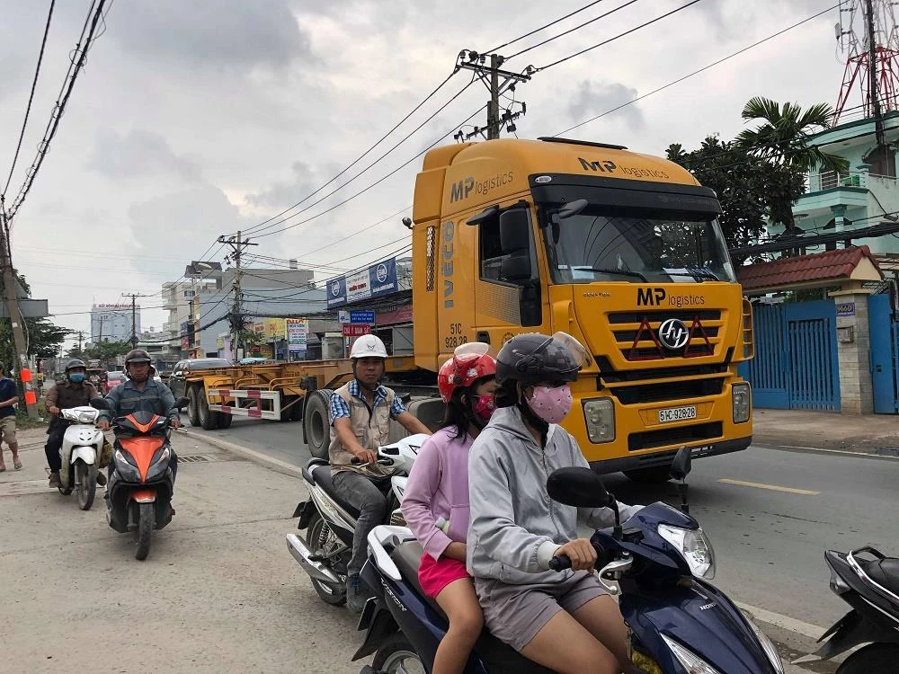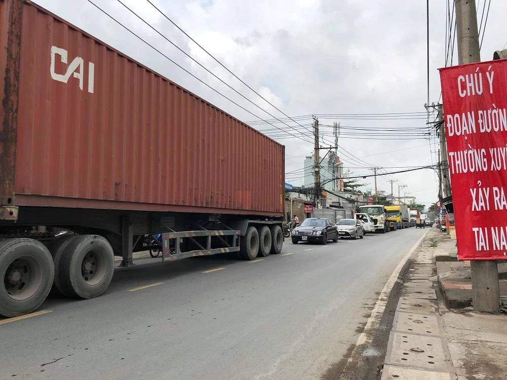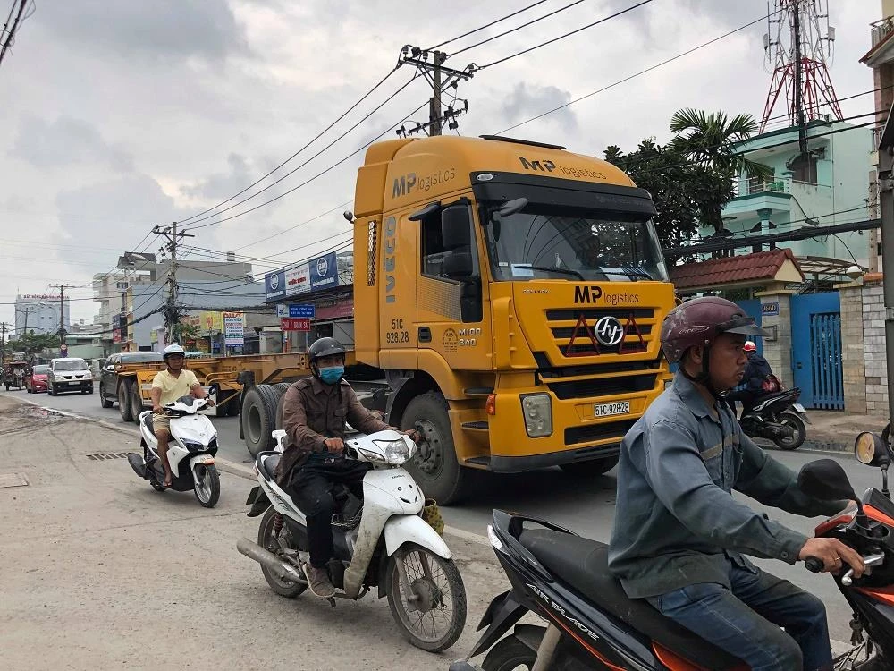 Tương tự, sáng 29-6, số lượng container đi vào cảng Cát Lái vẫn chưa hạ nhiệt, nhiều phương tiện vẫn xếp hàng dài trên đường Nguyễn Duy Trinh. Do đường quá nhỏ hẹp, nên mỗi khi hai container đi ngược chiều gặp nhau thì một phương tiện phải dừng hẳn để nhường cho xe đối diện đi trước, tạo ra ùn tắc. Người điều khiển xe máy cũng đành phải leo lên vỉa hè để đảm bảo an toàn.