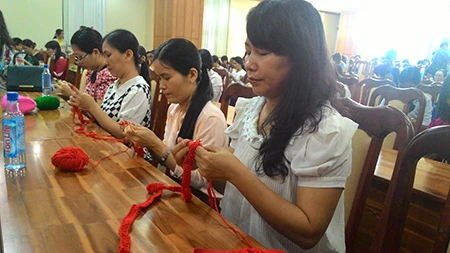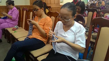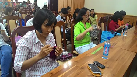 Các giáo viên đang khéo léo móc từng sợi len để đan thành những chiếc khăn.
