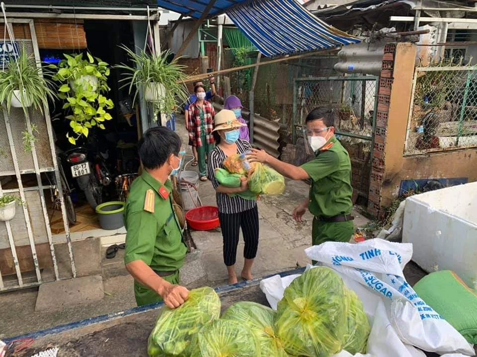 Bà Ba xa quê vào Sài Gòn mưu sinh đã gần chục năm nay. Bà có quầy nước nhỏ ven đường. Ngày trước còn có đồng ra đồng vào trả tiền thuê trọ, ăn uống. Nhưng từ ngày dịch bệnh COVID-19 bùng phát trở lại, giãn cách xã hội, cuộc sống của gia đình bà lay lắt qua ngày. Về không được mà ở cũng chẳng xong. Những kí gạo, gói mì, bó rau lúc này quý hơn bao giờ hết. “Siêu thị thì đâu có tiền mà mua. Giờ có muốn mua bó rau cũng phải nghĩ. Cảm ơn các chú công an!”- bà Ba nói.