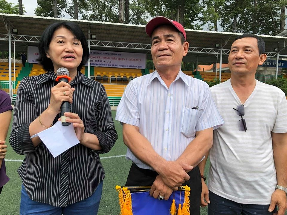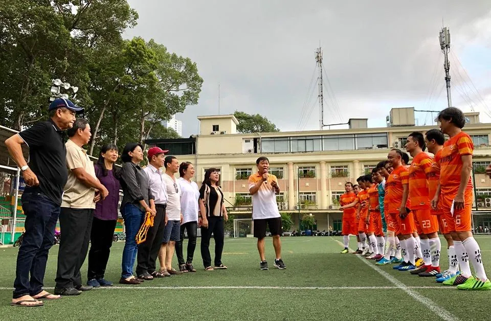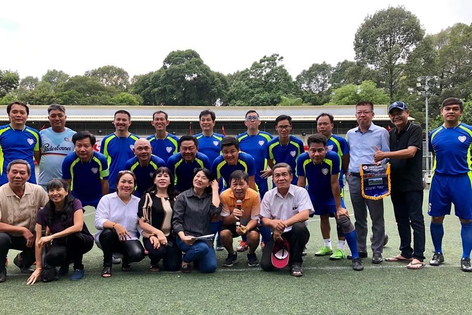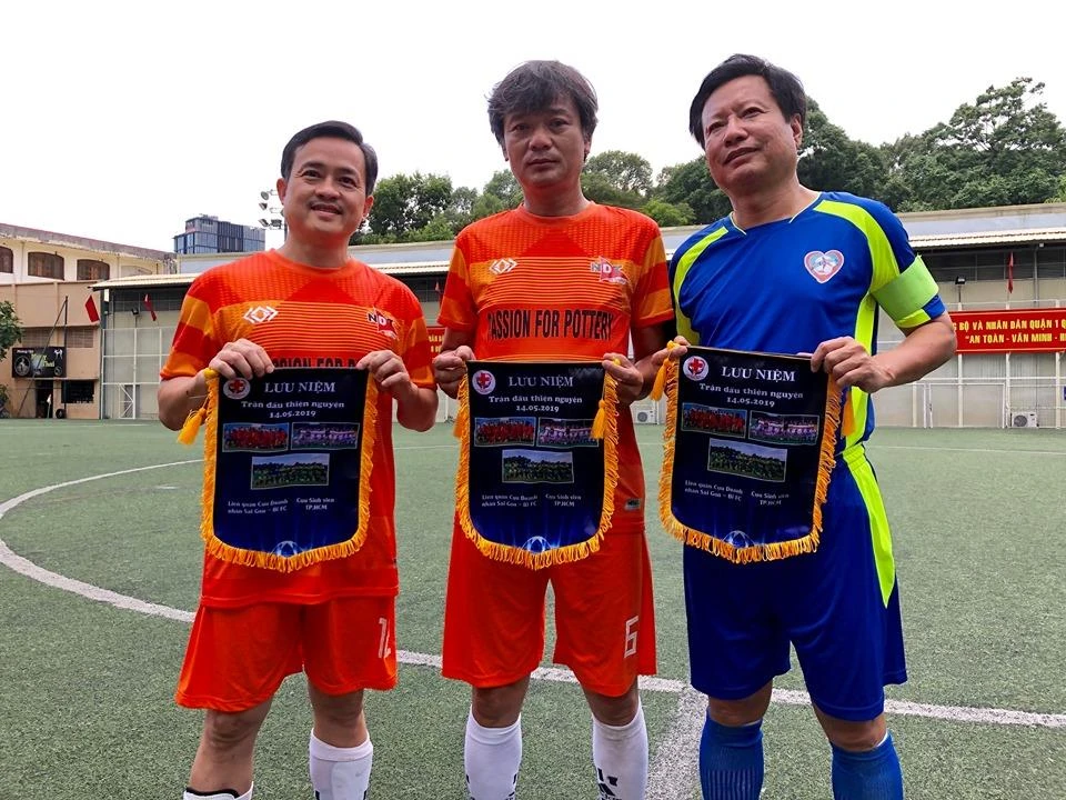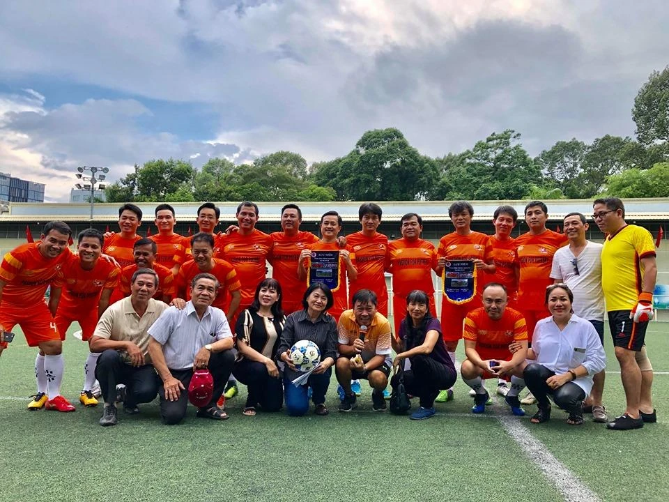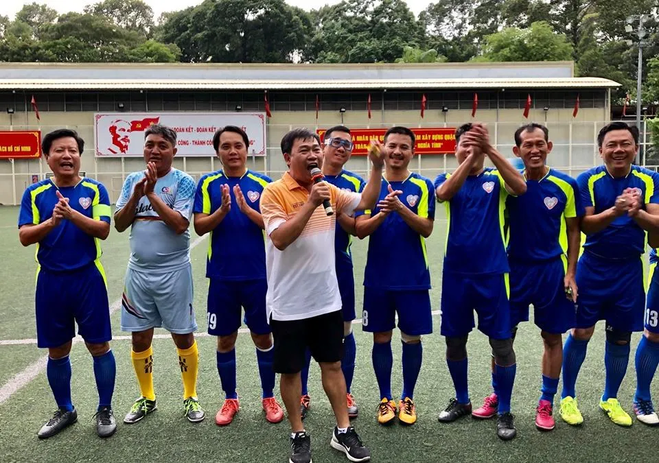 Nhà báo Nguyễn Nguyên sôi nổi cùng các cầu thủ vui tính của đội Cựu Sinh viên TP.HCM với thông điệp "Ở đâu cần chúng tôi có".
