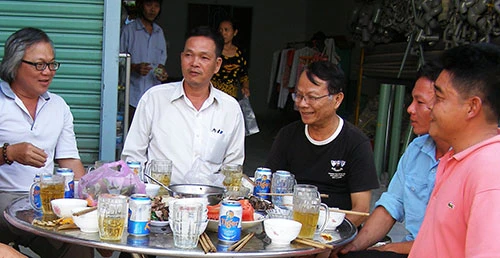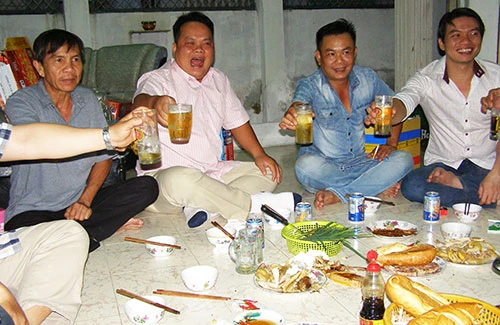Phần thịt dành biếu bà con, anh Hùng chỉ giữ lại bộ lòng và đầu heo để “chén tạc chén thù” với các anh, các chú trong tổ. Lúc này căn bếp nhà anh chộn rộn thấy rõ vì hàng xóm cùng chung tay mỗi người mỗi việc. Người nấu cháo, người làm phá lấu, cũng có người kể chuyện tiếu lâm… khiến không khí thêm rộn ràng. Nấu nướng xong cánh đàn ông dọn ra trước nhà lai rai. “Vì mưu sinh cuộc sống nên mỗi người mỗi việc, ít có cơ hội ngồi chung chuyện trò. Chỉ có dịp như thế này láng giềng mới ngồi lâu, hỏi han sức khỏe, cuộc sống. Những lúc như vầy, tôi cảm thấy tình làng nghĩa xóm gắn bó nhau hơn” – anh Hùng nói thêm.