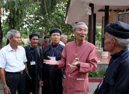 Tiến sĩ sử học Nguyễn Nhã (áo hồng nhạt) trò chuyện với các thành viên Ban khánh tiết đình Thân Nhơn - Ảnh: Hoàng Giang