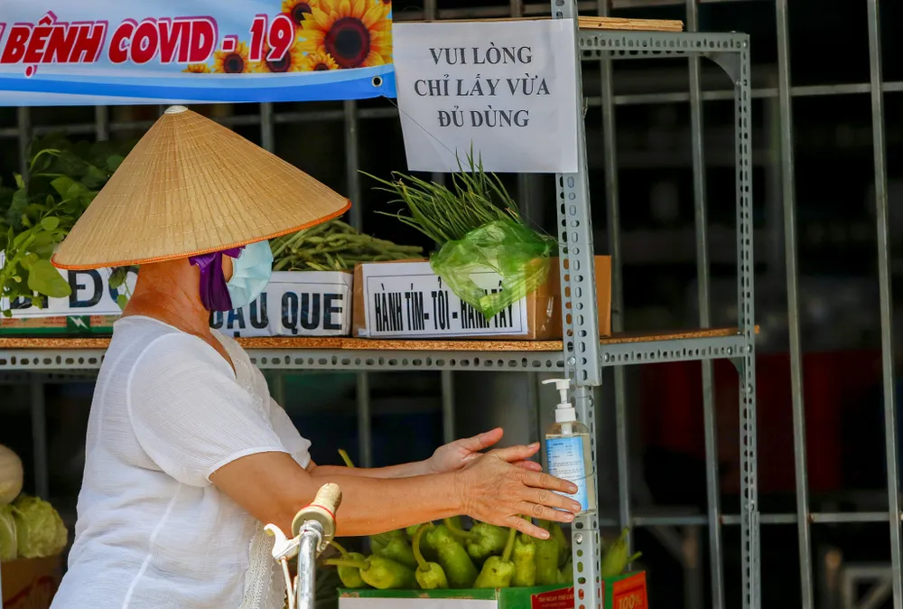 Trước khi nhận thực phẩm, tất cả người dân đều phải sát khuẩn tay.