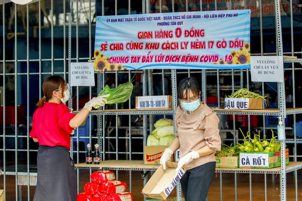 Khoảng 10 giờ sáng mỗi ngày, cán bộ Ủy ban Mặt trận Tổ quốc (UBMTTQ) phường Tân Quý, Hội liên hiệp phụ nữ và Đoàn thanh niên phường có mặt trước hẻm 17, đường Gò Dầu để cung cấp nhu yếu phẩm cho "Gian hàng 0 đồng".