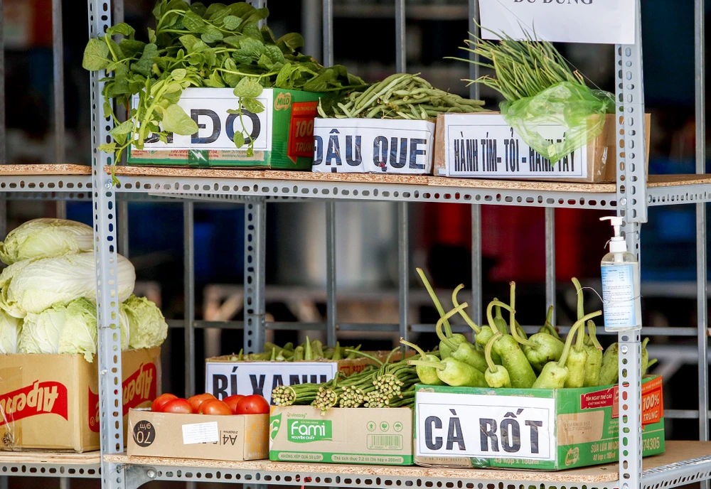 Các nhu yếu phẩm sau đó sẽ được sắp xếp lên khu vực "Gian hàng 0 đồng" theo từng thùng nhỏ ghi tên từng loại, tất cả đều gọn gàng, thuận tiện để người dân trong khu cách ly dễ dàng chọn lựa.