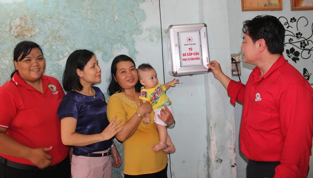 Ra quân gắn tủ sơ cấp cứu tại một "địa chỉ tin cậy ở cộng đồng" tại phường Tam Bình, quận Thủ Đức. Ảnh: HL