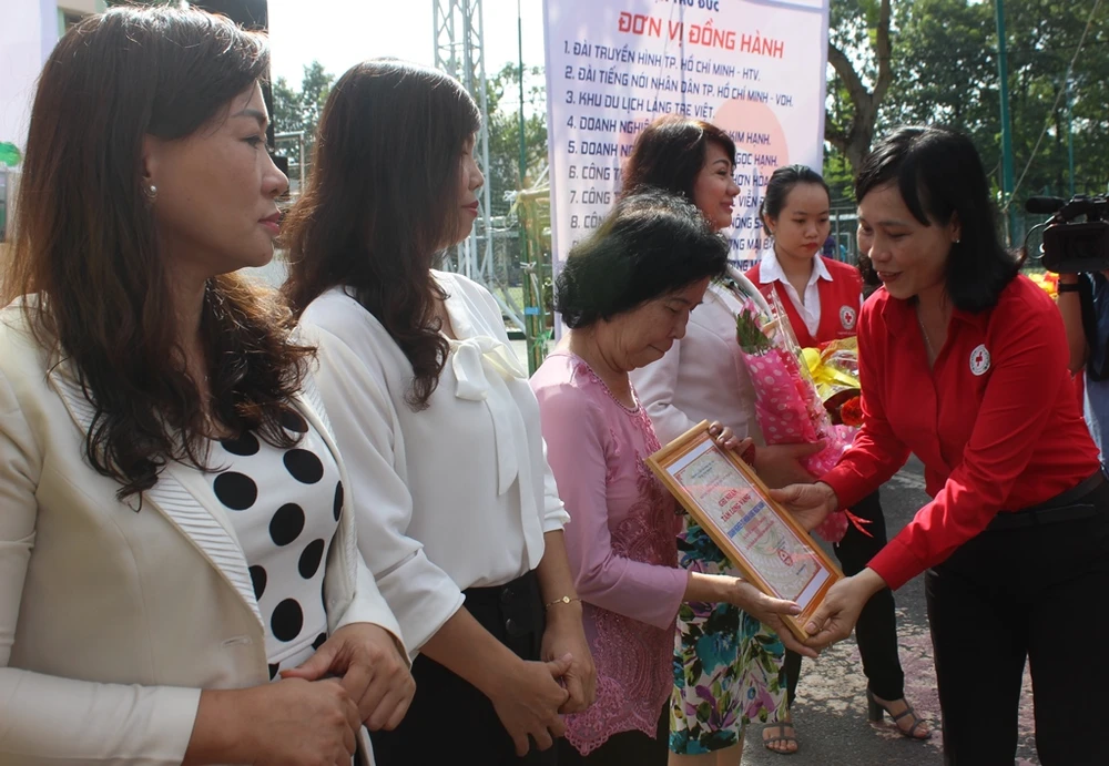 Bà Đặng Trần Nguyên Thảo, Chủ tịch Hội Chữ thập đỏ quận Thủ Đức tri ân các đơn vị đồng hành. Ảnh: HL