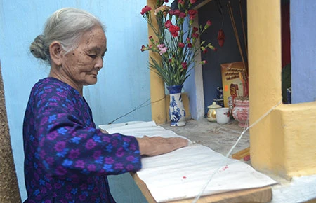 Mẹ Huỳnh Thị Kế bên bàn thờ của liệt sĩ Nguyễn Phú Đoàn ở góc sân nhà. Ảnh: TẤN TÀI