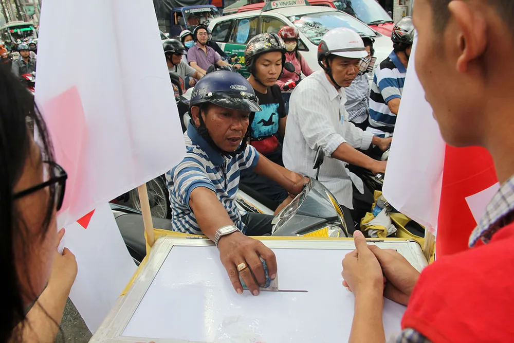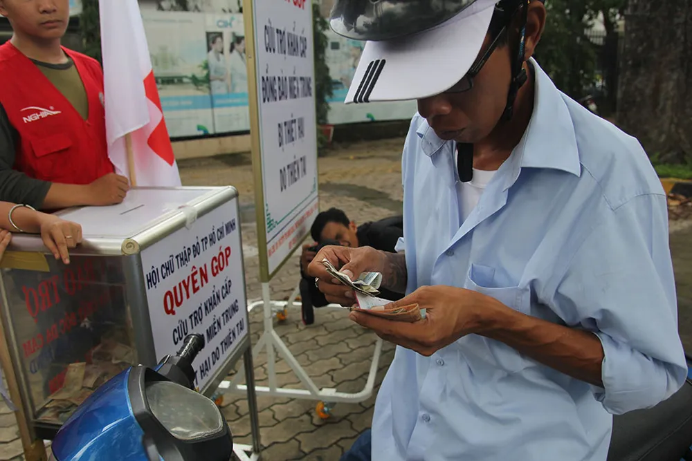 Những người lao động trên đường phố Sài Gòn dừng lại trước thùng quyên góp, trích số tiền của mình ủng hộ người dân bị thiên tai.