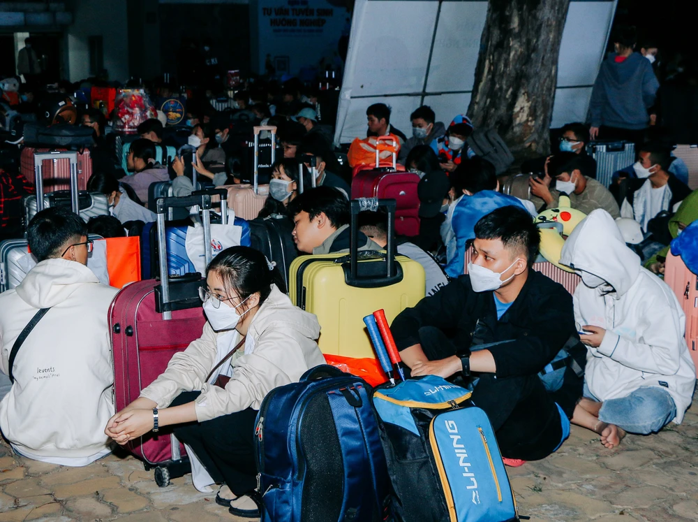 Sinh viên lỉnh kỉnh đồ đạc và có mặt từ rất sớm để sẵn sàng đón xe về quê đón tết. Ảnh: NTCC |