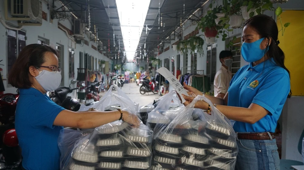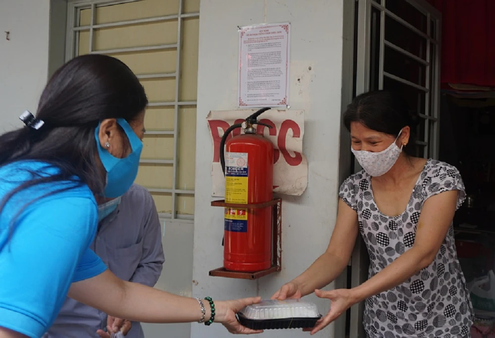 Những suất cơm nóng hổi đã được cán bộ Liên đoàn Lao động quận Tân Phú và chủ nhà trọ trao tận tay người lao động. Ảnh: NGUYỄN QUYÊN