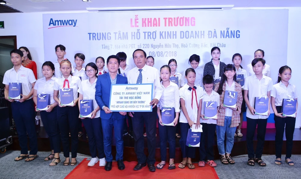 Nhân dịp khai trương, Amway phối hợp với Hội Khuyến học TP Đà Nẵng trao tặng 20 suất học bổng “Amway - Cùng em đến trường” cho các em học sinh vượt khó vươn lên đạt thành tích tốt trong học tập tại địa phương.