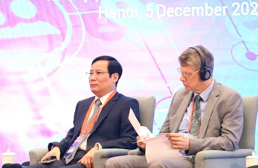 Ông Phạm Tấn Công, Chủ tịch VCCI (trái) tại phiên tọa đàm về lao động chiều 5-12. Ảnh: QH