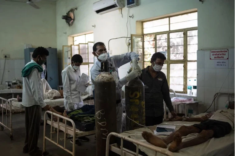 Cung cấp ôxy cho bệnh nhân COVID-19 tại phòng cấp cứu một bệnh viện ở TP Kotputli, bang Rajasthan (Ấn Độ) hồi giữa tháng 5. Ảnh: REBECCA CONWAY/GETTY IMAGES