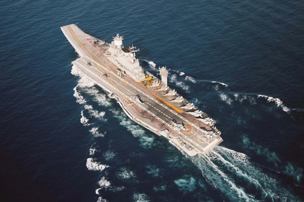 Tàu sân bay INS Vikramaditya được triển khai theo dõi cuộc tập trận hải quân chung giữa Pakistan và Trung Quốc. Ảnh: TWITTER