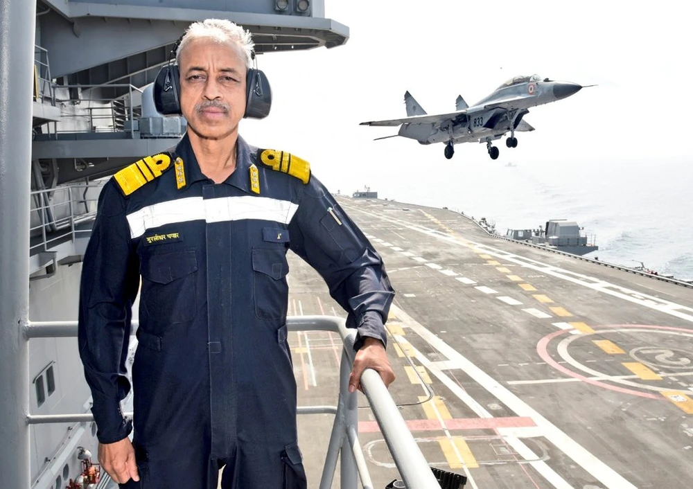 Phó Tham mưu trưởng Hải quân Ấn Độ - Phó Đô đốc Murlidhar Sadashiv Pawar trên tàu sân bay INS Vikramaditya. Ảnh: TWITTER