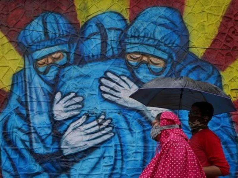 Một người phụ nữ và con trai đi ngang qua bức vẽ các nhân viên y tế trên đường phố ở Mumbai, Ấn Độ, ngày 1-12. Ảnh: REUTERS