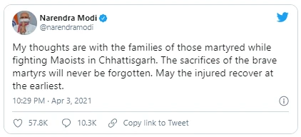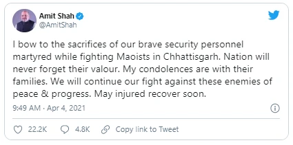 Bộ trưởng Bộ Nội vụ Ấn Độ Amit Shah tuyên bố chính phủ sẽ không dung thứ cho nhóm phiến quân Maoist, sẽ tiếp tục cuộc chiến chống lại “kẻ thù của hòa bình và tiến bộ” và “có một phản ứng thích hợp để ngăn chặn các cuộc tấn công như vậy".