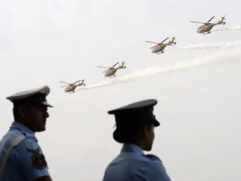 Các trực thăng Chetak của Ấn Độ biểu diễn tại triển lãm hàng không ở TP Hyderabad hôm 17-6. Ảnh: AFP