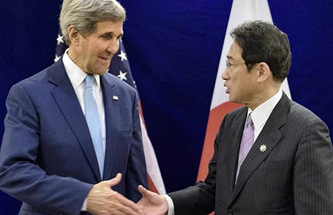 Ông Fumio Kishida đã kêu gọi không tiến hành các biện pháp đơn phương làm gia tăng căng thẳng và phải hành động phù hợp với luật pháp quốc tế (ám chỉ âm mưu thay đổi nguyên trạng của Trung Quốc trên biển Đông). Bên lề hội nghị ngày 6-8, ông Fumio Kishida đã hội đàm với người đồng cấp Mỹ John Kerry (ảnh). Hai bên đã nhất trí tiếp tục tăng cường hợp tác về các vấn đề hàng hải.