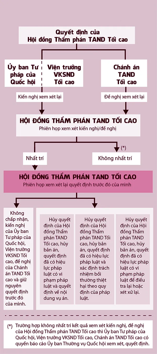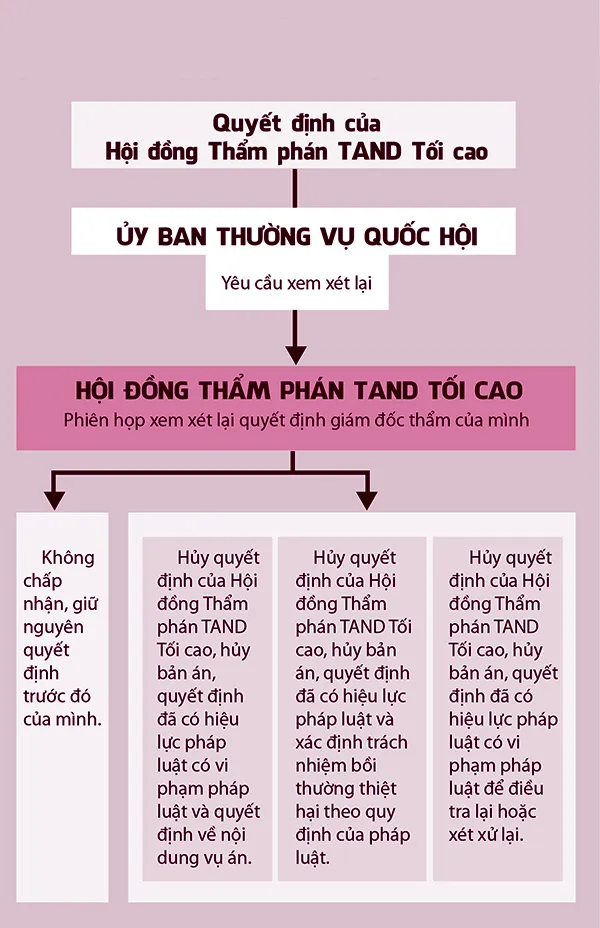 Còn với kiến nghị của Ủy ban Tư pháp và viện trưởng VKSND Tối cao hoặc đề nghị của chánh án TAND Tối cao, HĐTP TAND Tối cao sẽ mở phiên họp xem xét kiến nghị hoặc đề nghị đó. Khi đó, HĐTP sẽ biểu quyết và cho ra kết quả “nhất trí” hoặc “không nhất trí” với kiến nghị, đề nghị đó. Nếu “nhất trí”, sau đó HĐTP TAND Tối cao sẽ mở phiên họp xem xét lại quyết định trước đó của chính mình, đồng thời ra một trong bốn quyết định quy định tại khoản 2 Điều 411 BLTTHS nói trên.