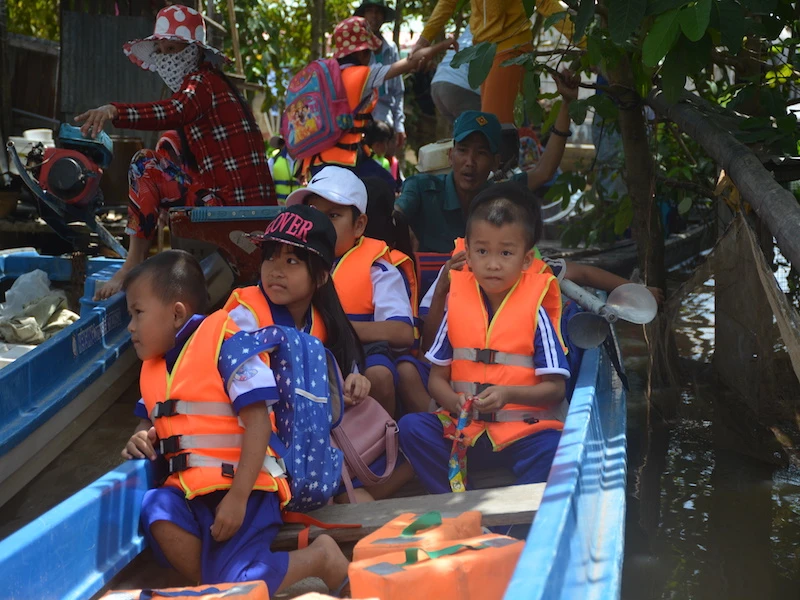 Học sinh trên địa bàn huyện An Phú (tỉnh An Giang) đi học vào mùa nước nổi. Ảnh: HẢI DƯƠNG