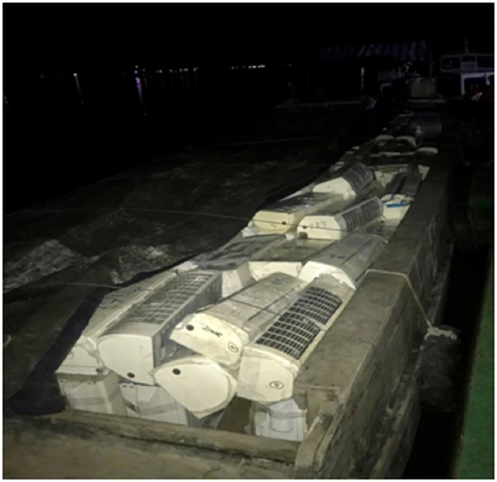 Qua kiểm tra, lực lượng chức năng phát hiện trên ghe gần 340 cục lạnh, nóng của máy điều hòa đã qua sử dụng.