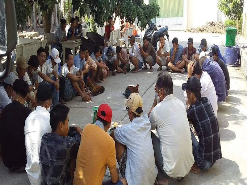 32 đối tượng bị bắt quả tang đang đá gà ăn tiền. Ảnh: QUỲNH MINH