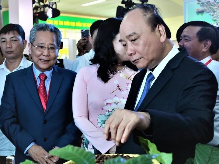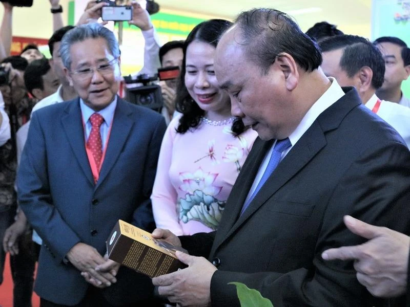 Thủ tướng Chính phủ Nguyễn Xuân Phúc tham quan khu trưng bày sản phẩm tại hội nghị.