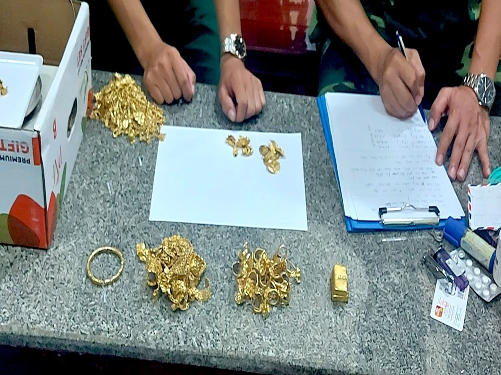 Qua kiểm tra, Tổ công tác phát hiện bên trong cabin xe có 03 bọc nilon màu đen, bên trong có chứa hai miếng kim loại màu vàng và nhiều sợi dây chuyền, vòng lắc tay, nhẫn (nghi là vàng) có trọng lượng khoảng hơn 2,8 kg. Kiểm tra trên người Trường, lực lượng chức năng còn phát hiện có 33,6 triệu đồng tiền Việt Nam và 400.000 Riel (tiền Campuchia).
