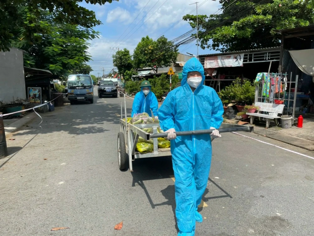 Lực lượng biên phòng hỗ trợ thức ăn cho người dân trong khu phong tỏa ở thị trấn Long Bình, huyện An Phú, tỉnh An Giang