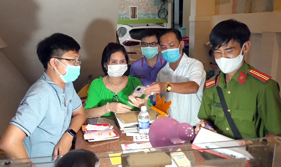 Công an kiểm tra khách sạn Anh Đào, thu giữ nhiều tài liệu và thiết bị liên quan. Ảnh: TT