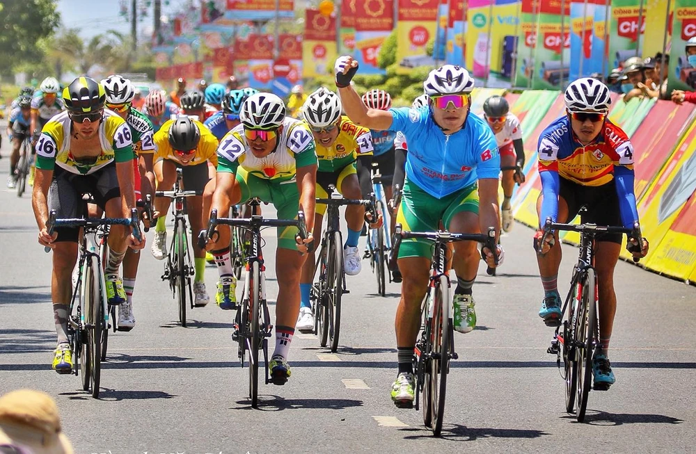 Tay đua Quàng Văn Cường (áo xanh) chiến thắng chặng, gạo Hạt Ngọc Trời An Giang thống lĩnh luôn danh hiệu thứ 5 của giải. Ảnh: ANH THUẬN