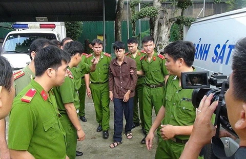 Bị can Nguyễn Hải Dương trong buổi thực nghiệm hiện trường vụ thảm sát ở Bình Phước. Ảnh: NGUYỄN ĐỨC