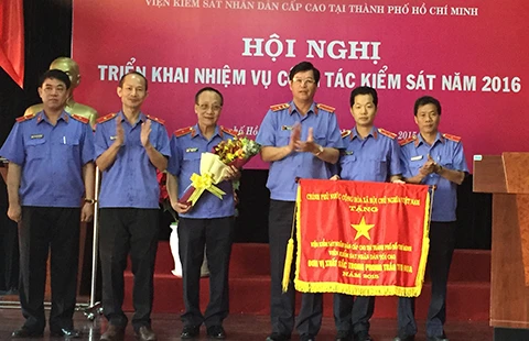 Phó Viện trưởng VKSND Tối cao Trần Công Phàn (thứ ba từ phải qua) trao cờ thi đua của Chính phủ cho ban lãnh đạo Viện Cấp cao 3. Ảnh: T.TÙNG