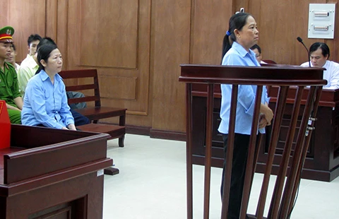 Bị cáo Bùi Thị Hòa (đứng trước vành móng ngựa) tại phiên tòa phúc thẩm. Ngồi phía dưới là bị cáo Đoàn Thị Anh Thư. Ảnh: D.HẰNG