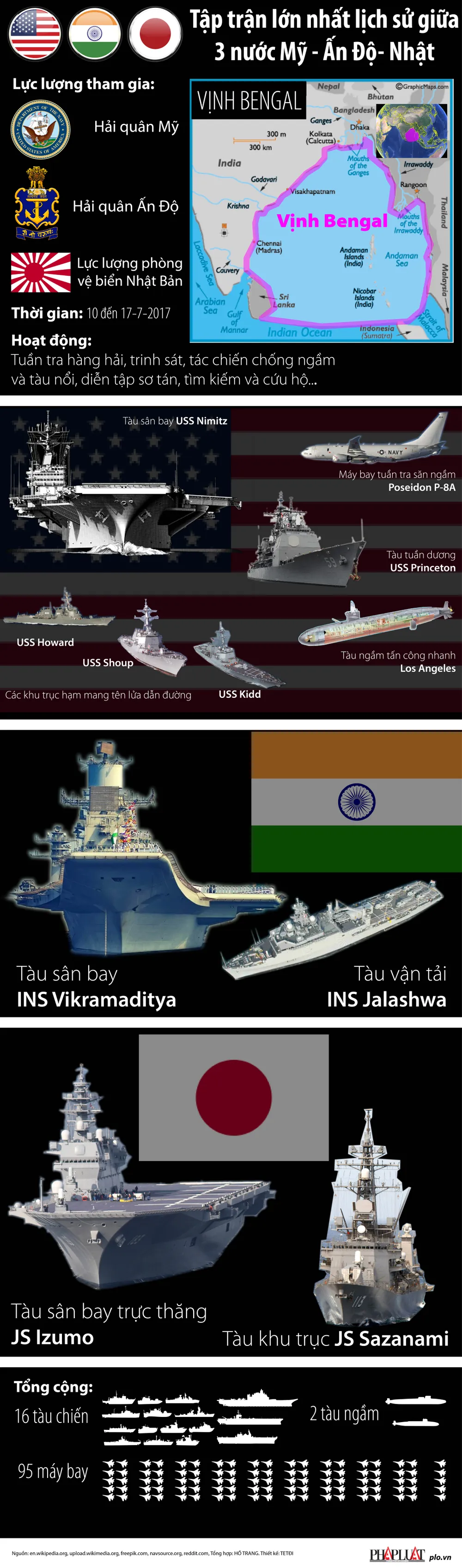 (PLO) - Hải quân Ấn Độ, Mỹ và lực lượng Phòng vệ Biển Nhật Bản đã bắt đầu cuộc tập trận lớn chưa từng có tại vịnh Bengal. Cuộc tập trận quy tụ lực lượng hùng hậu với sự tham gia của tàu sân bay USS Nimitz của Mỹ, tàu sân bay INS Vikramaditya của Ấn Độ và tàu sân bay trực thăng JS Izumo của Nhật Bản, cùng 18 tàu chiến mặt nước, 2 tàu ngầm và 95 máy bay các loại.