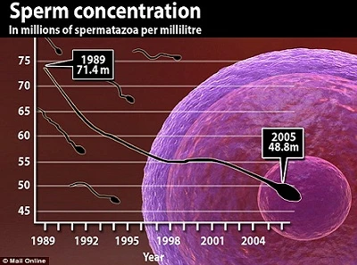 Tuy nhiên, trong một nghiên cứu hơn 10.000 người đàn ông trong vòng 17 năm đã cho thấy sự suy giảm lượng tinh trung rõ rệt. Cụ thể, 30% có lượng tinh trùng giảm, đồng thời cũng giảm tỉ lệ người có tinh trùng bình thường.