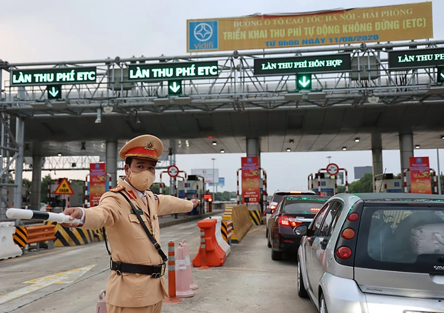 CSGT phân luồng trên cao tốc Hà Nội - Hải Phòng. Ảnh: T.PHAN