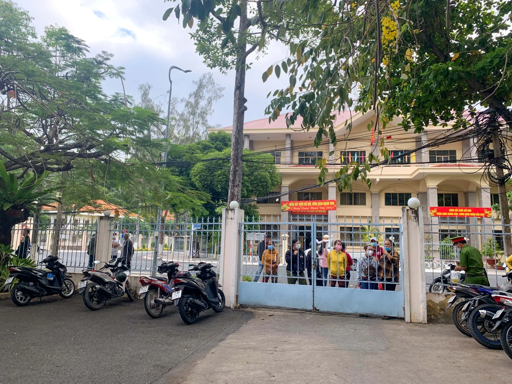Chỉ những người có lệnh triệu tập mới được vào tòa, người thân của của các bị cáo đứng ngoài cổng tòa.