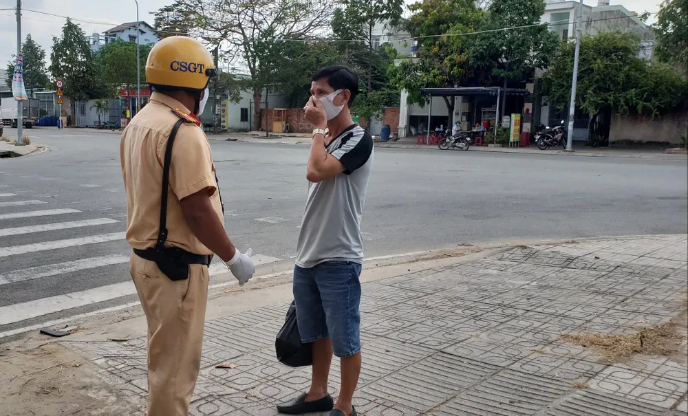 CSGT giải thích, nhắc nhở người đến cung cấp nhu yếu phẩm cho người thân bên trong khu cách ly. Ảnh: TỰ SANG
