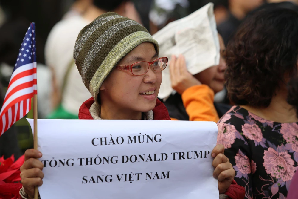 Chú Nguyễn Nam Long mang cờ đến chờ đón Tổng thống Trump.