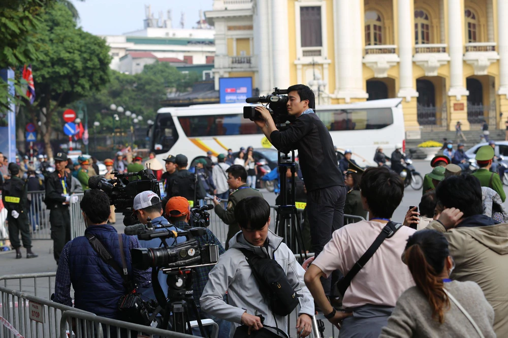 Báo chí tác nghiệp gần khu vực diễn ra hội nghị.