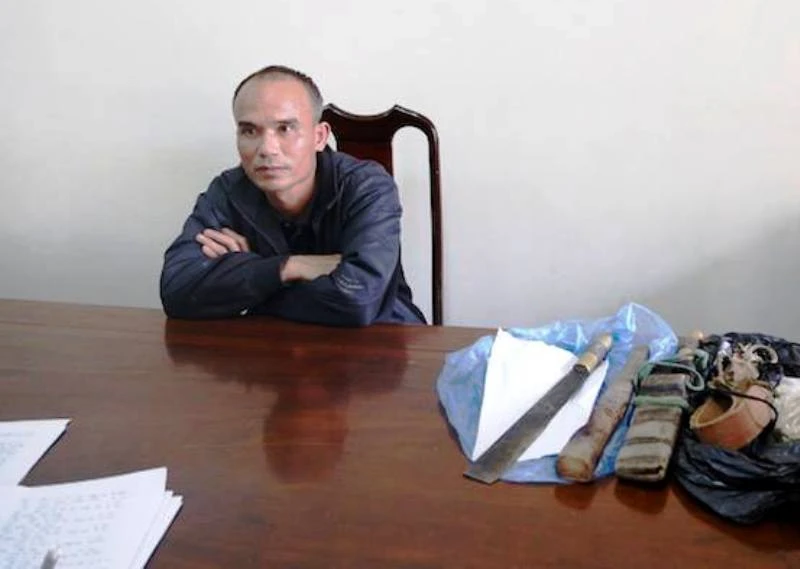 Phan Trọng Sơn với dụng cụ săn bắt voọc chà vá chân nâu.