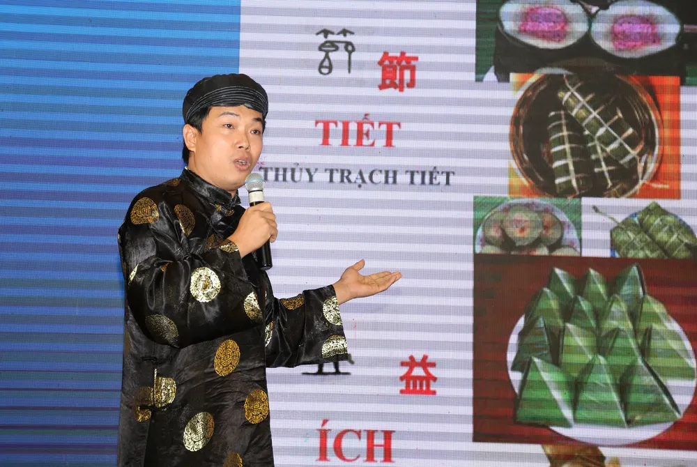 Diễn giả Hồ Nhựt Quang nói về nguồn gốc bánh tét, bánh ít trong ngày tết cổ truyền miền Nam.