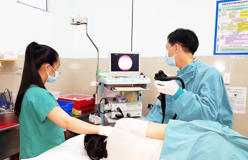 Bệnh nhân đang được nội soi lấy que thịt nướng ra khỏi ruột non. Ảnh: BVCC