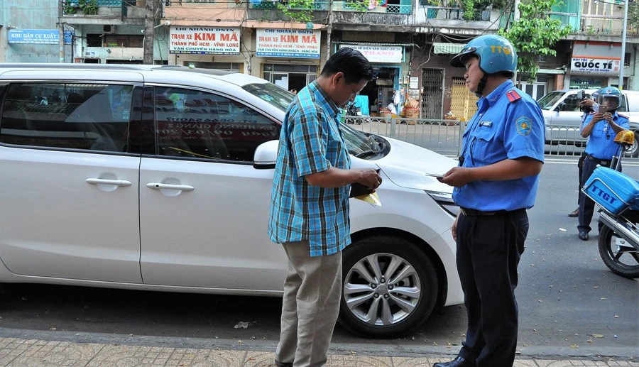 Cách đó không xa, một ô tô bảy chỗ biển số 67A-044.40 cũng đậu chễm chệ dưới lòng đường, dù lúc này khu vực này cấm đậu xe. Khi đoàn kiểm tra đến, một người đàn ông tên Ngô Tấn Vinh từ quán bún bò bước ra nhận là tài xế và ký vào biên bản vi phạm. Ông Vinh giải thích rằng từ An Giang mới lên TP.HCM và không rành đường sá Sài Gòn, cũng không biết nơi đây cấm đỗ xe. Tuy nhiên, việc đậu xe này được xác định là vi phạm khoản 3 Điều 5 Nghị định 46/2016, tức đỗ xe nơi có biển cấm đỗ với mức phạt từ 600.000 đến 800.000 đồng. Ảnh: MP