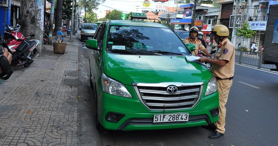 Lực lượng liên ngành CSGT, thanh tra giao thông vừa tuần tra được một đoạn thì phát hiện taxi biển số 51F-288.43 đậu trước 375 Trần Phú (phường 8, quận 5), trong khi nơi đây có biển cấm đậu theo giờ. Các CSGT Đội Chợ Lớn chờ một hồi không thấy tài xế xuất hiện để lập biên bản, đang định gọi xe cẩu về bãi tạm giữ thì một thanh niên hớt ha hớt hải có mặt ký vào biên bản vi phạm. Trả lời PV, người này (tên Nguyễn Duy Tân) cho biết: “Em đang chạy xe thì bị đau bụng quá nên dừng xe, ghé vào quán cà phê “xử lý”. Xui thì chịu vậy”. Ảnh: MP